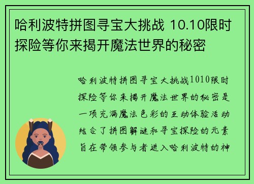哈利波特拼图寻宝大挑战 10.10限时探险等你来揭开魔法世界的秘密